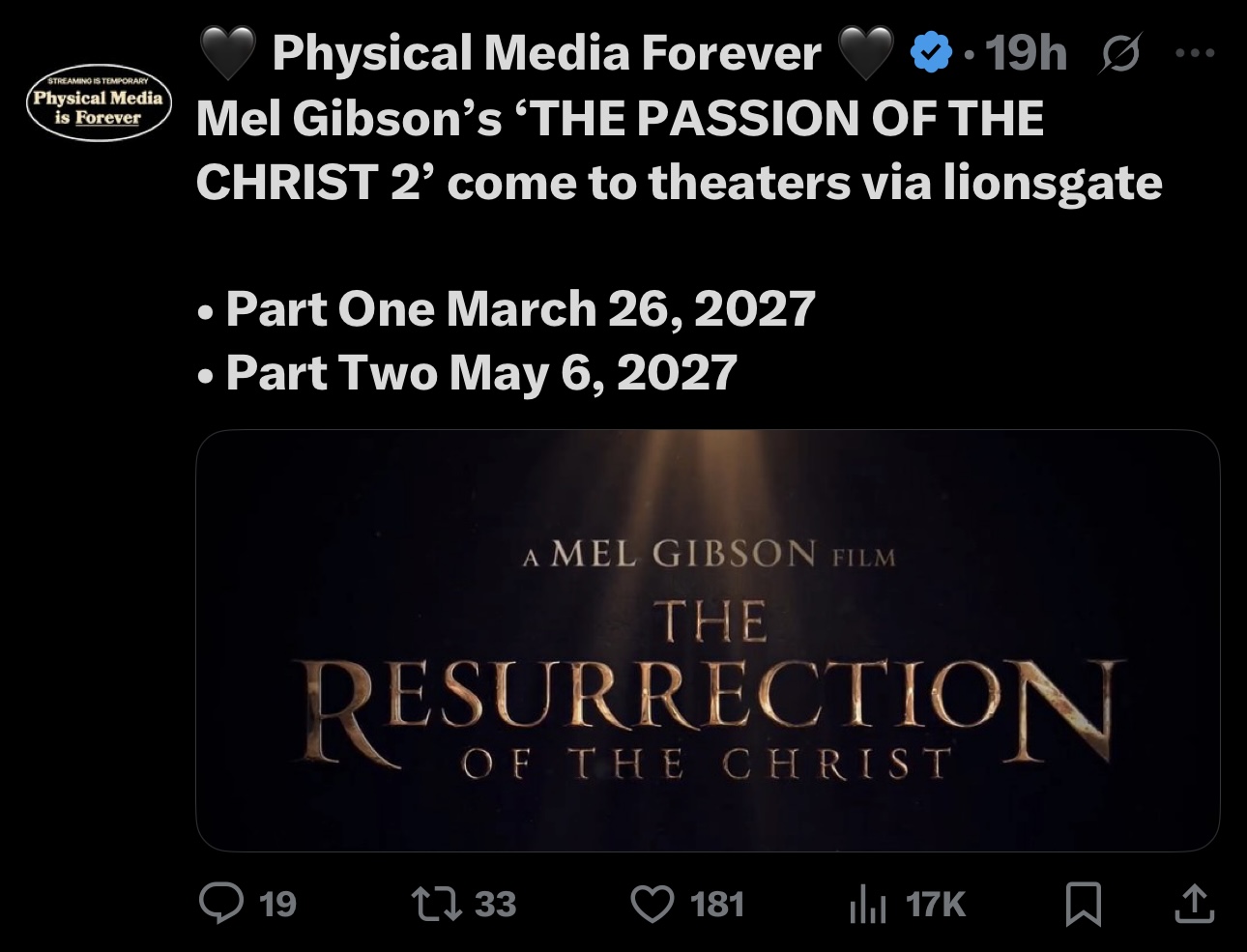 I am legit curious, I think Gibson is excellent director, I just hope he split it in two because he has much to say and not just for money, because he did hit on harder times.