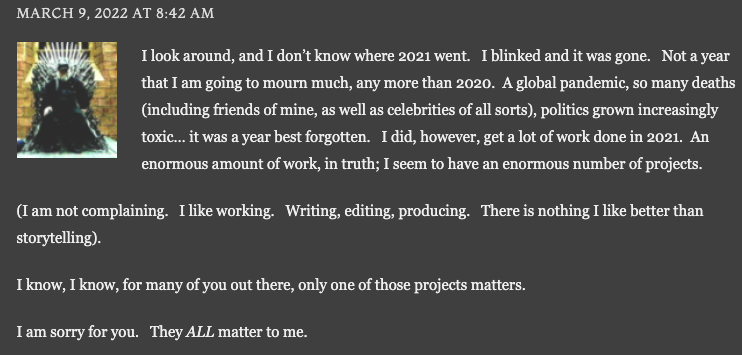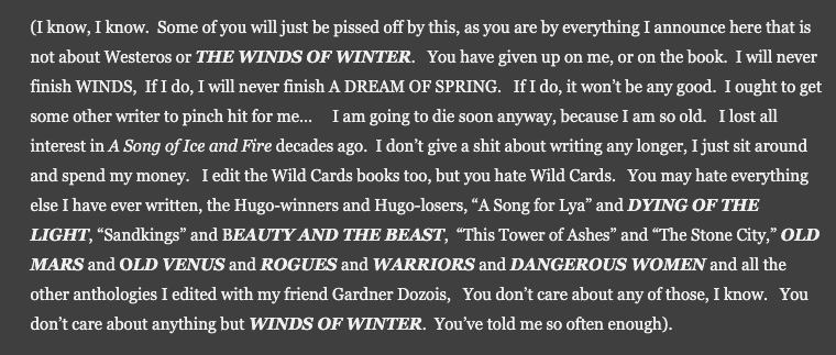 Imagine if one of his interns rage posted TWoW/ADoS on ao3 under a different name because he wasn't getting paid enough, and now he has to rewrite the entire thing because of copyright.