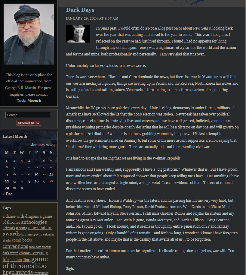 My real money is on he painted himself into too many corners for a fat fuck to handle. Lets be fucking real here - nerds that look like george are not some high IQ wizard most of the time. It takes him 10 fucking years to finish a book not because he's marinating / thinking really hard - its cause it takes him 10 bloody years just to think through all the bullshit he wrote - literally intel pentium CPU vs ryzen threadripper Tolkien shitting out LOTR in just 12 years.