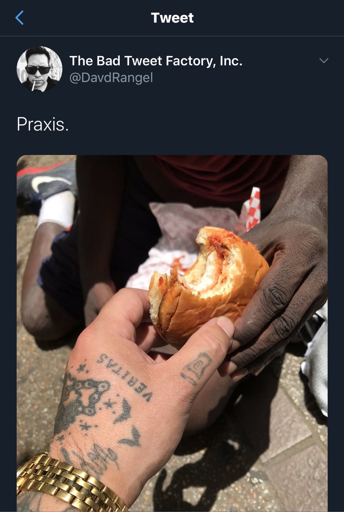 Do you think he gave him a partly eaten sandwich or do you think he gave it to him and forgot to ask for a clout photo before he had already started chowing down?