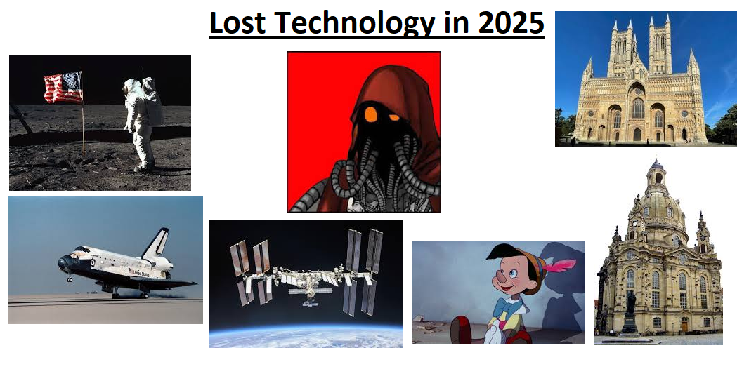 >same vibes. We're losing a lot of stuff we used to take granted can no longer be replicated. And if we're talking the West stuff like nuclear power plants, high-speed rail are also lost tech