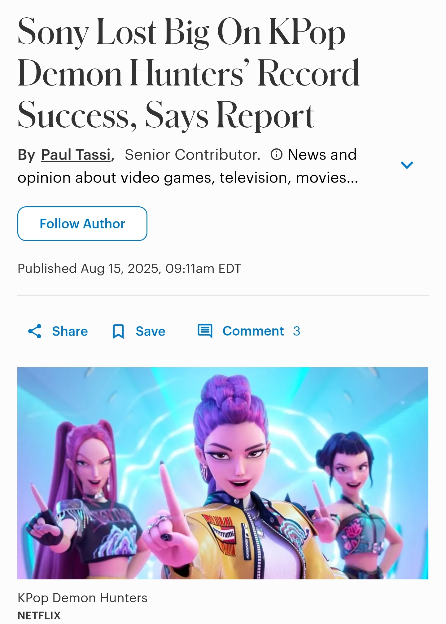 >Sony made KPop Demon Hunters for $100 million, then sold the rights to Netflix. Now, reports are that Sony will end up making just $20 million in profit on the deal thanks to those terms, as anything that happens from here, thatβs all Netflix, since they own the property.
