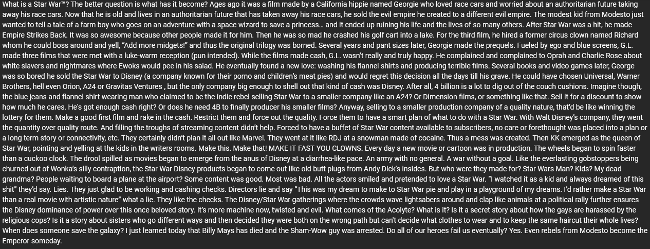 He said the only reason why fags are pretending prequels are "misunderstood" is because the Disney SW are so trash they look better in comprasion
