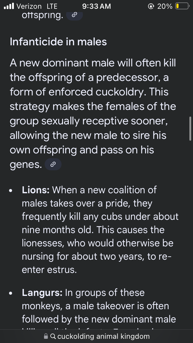it doesnt talk about infanticide anymore in the second search, but replaced it with "some males choose to knowingly raise the cuck offspring anyway".