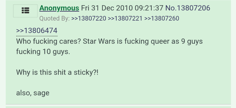 Jesus Christ. And you don't even get paid for it, if George "BLM kill whitey my black wife's black son will inherit all of my billions and make the world an even worse place than my shekelgrub sellout toy merchant ass ever did" Lucas was 4chan you absolute faggots would be the tranny jannies.
