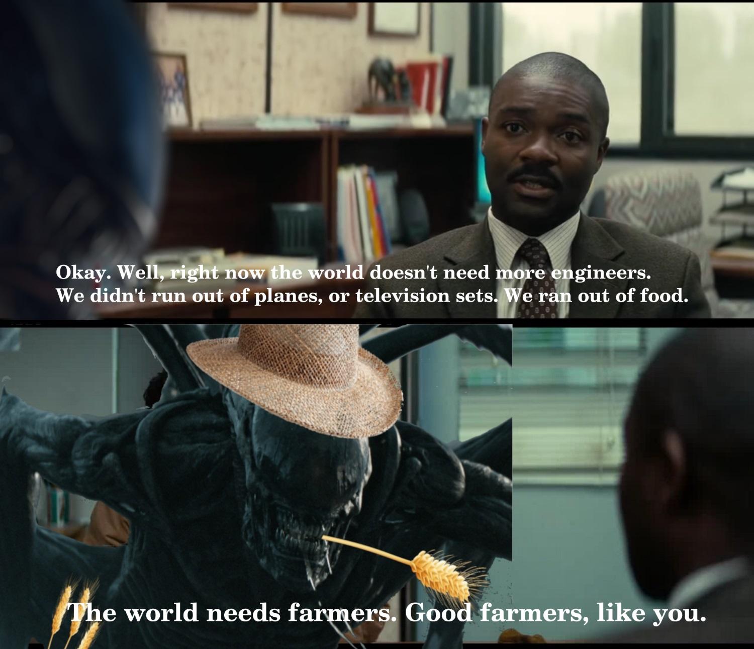 >Old Xeno >Old Henry inspired western where Xeno just wants to retire and leave farming his wheat in peace, but the local colonial marine won't leave him alone and gets a squad together to run xeno out of his farm >pulls chest from under bed, opens it, reveals his egg, unused for years