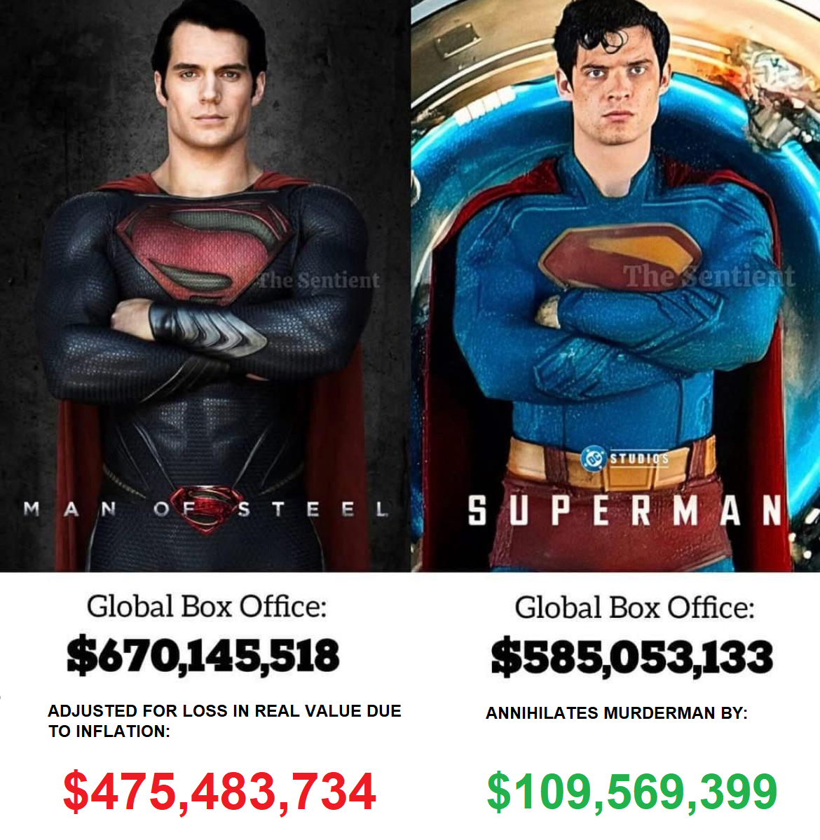 Here's my unbiased opinion since I don't care about superheroes movies in general. The Snyder Superman movie came in a time where any superhero movie would easily break a billion dollars because it was the thing of the moment and we were talking about the most famous superhero in history at the time. The Gunn's superman came in a time where people no longer cared about superhero movies and the DC brand had been ruined after years of poorly critically accepted movies. Due to that, it's a miracle that the new movie was even profitable at all. There's not a specific person to blame since Disney, Warner, Sony and a lot of different people were equally responsible for killing capeshit. My spicy comment is that if the new Superman movie came out before the Snyder one, it'd probably make way more money than it did now because from what I know, Gunn knows the formula to make a popular capeshit movie, but 10 years ago or something. You could make the best superhero movie ever and people still wouldn't bother to watch it, that's why Disney is doing everything possible to bring people back to the movie theaters like bringing Robert Downey Jr back for example.