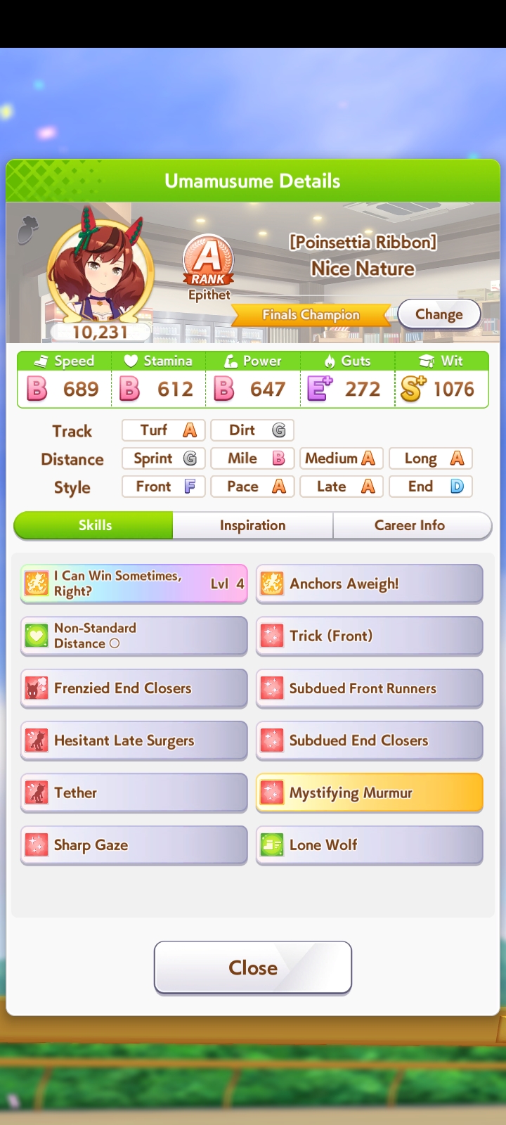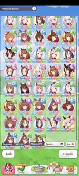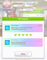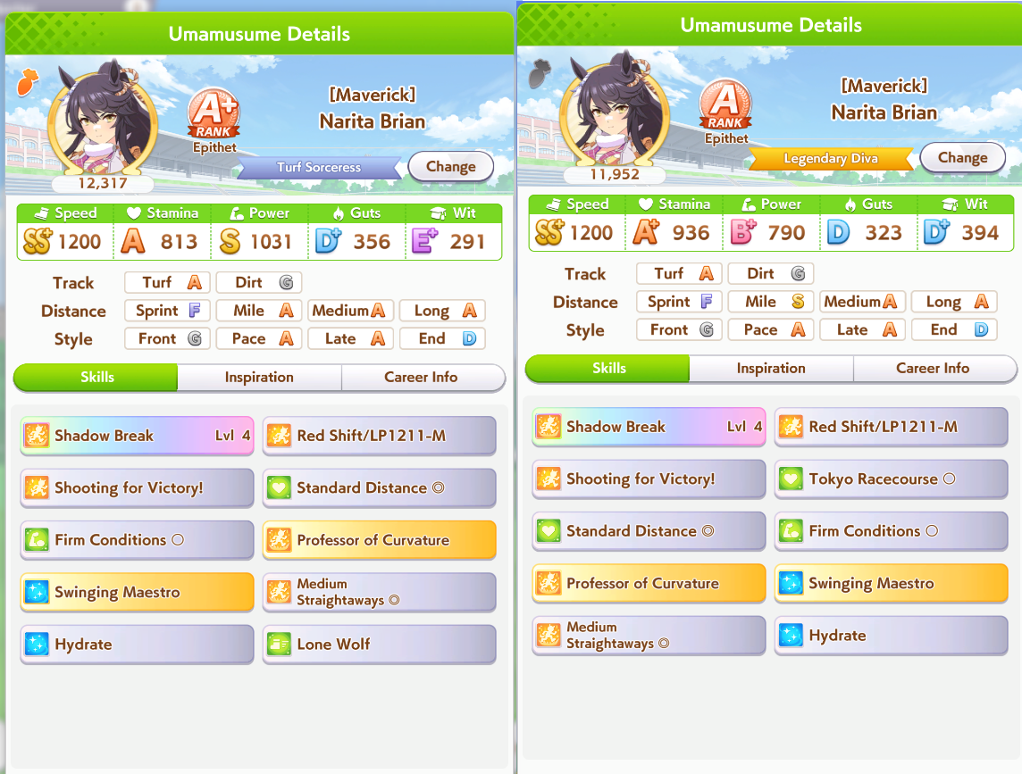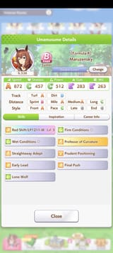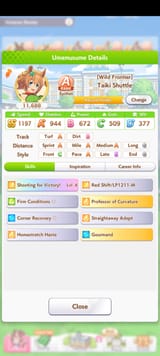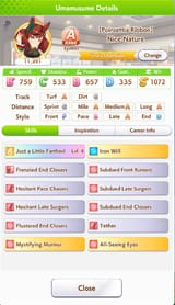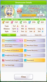 The general debuffs you want are subdued, flustered, and hesitant. That will fuck up the enemy stamina. Get more of those for pace chasers. Tether and Sharp Gaze are good and fine. It's better to run a debuffer than not to run one at all even if it's not optimal. Try and make another one if you can. She'll still be useful even if you dont have her maxed out unique ability. You only need about 600-700 wit for your abilities to proc regularly. After that you can boost up her other stats if you want.
