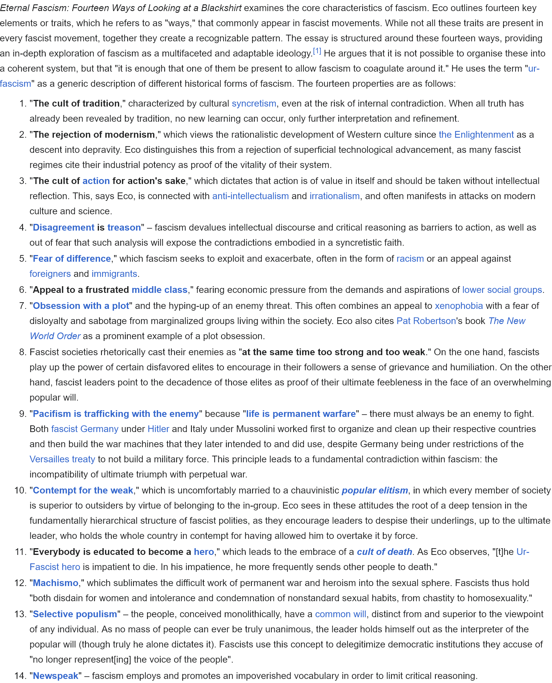 one state party with a supreme leader that gets worshiped and propagandized, together with ultra nationalism and militaristic aggression
