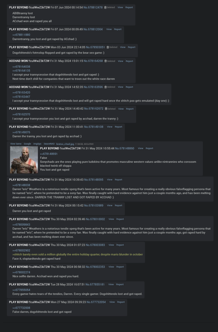 Take the guy who spams "you lost and got raped, Eric" for instance. He specifically targets Nintendo threads just to push them off ASAP and because one of the peooke behind it is a mod his posts never get deleted.