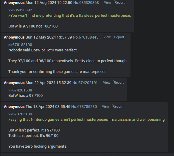 So as long as nobody literally said "IT'S PERFECT" then that's enough for you? So anons could be obnoxious cunts and say "haha it's a 97/100 and better than every other game in existence, but I technically didn't call it perfect :))))))" and that's fine with you?