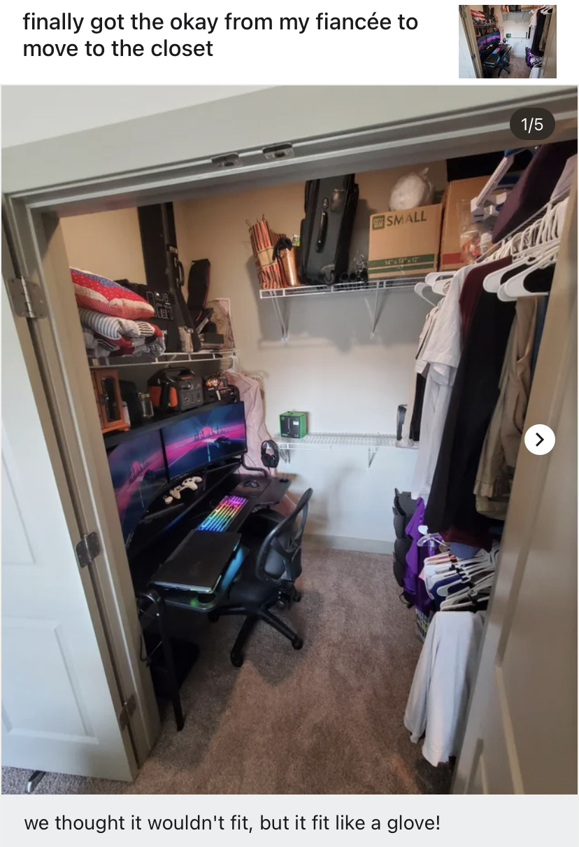 Im married and have a 1 year old. I actually understand him wanting to be in the closet for a gamer cave and thought about doing it myself because it looks like it would be cozy (my walk-in closet is about 2-3 times the size of his though, its basically another room).