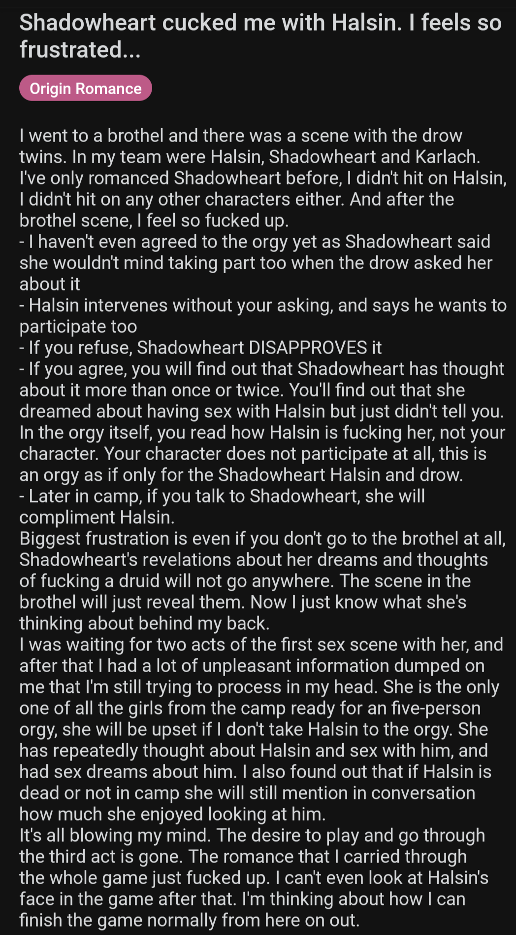 Now that the annoying hype wave has died down, I was like "alright, I'll check this game out now" and I am just about 50 hours into it. I killed all the gobbos and orcs and ogres in Act 1 and chopped off Minthara's head. I am currently genociding the dark iron dwarves in the Underdark and.... I think I am actually having a lot of fun with this game, but I don't get why it's a 10/10. Like for me? It's a high 8, maybe a 9 depending on how the story continues.... maybe the game will become 10/10 as it goes on.... idk... but so far, even though I seem to be enjoying it a lot so far, I just don't see why it was such a huge cultural phenomenon for a good year after it came out.