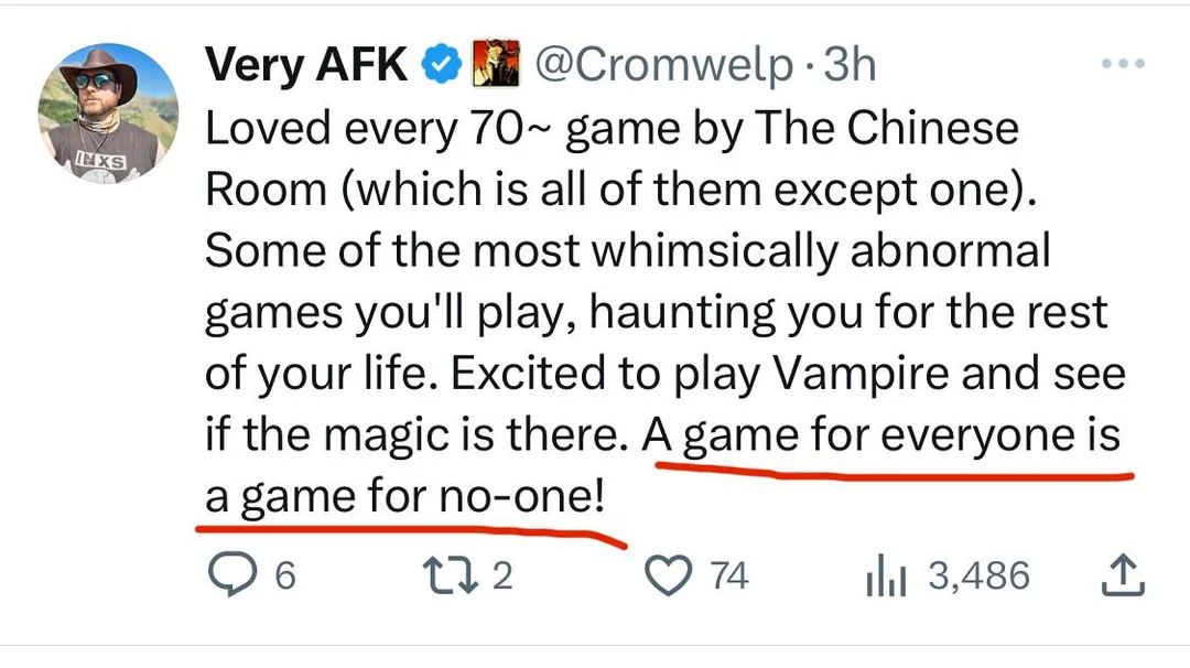 The reality is that a lot of these forums are frequented and even controlled by seething nerds with a vendetta against the mainstream gamerbros. Which again, it's completely valid to express frustration that larger developers tend to chase mainstream appeal at the expense of niche genre preferences but being a good reviewer means not letting those frustrations cloud your judgement. And we're obviously well past that with most RPG forums. They make it a point to overrate small janky niche games and underrate polished mainstream games because fundamentally they're not interested in objective critique, they're pushing an agenda. If they lie to everyone and say VTMB is one of the best games of all time while Skyrim is unplayable garbage, they hope they can force the industry to bend towards their preferences.