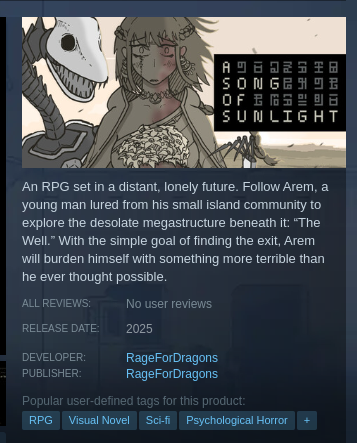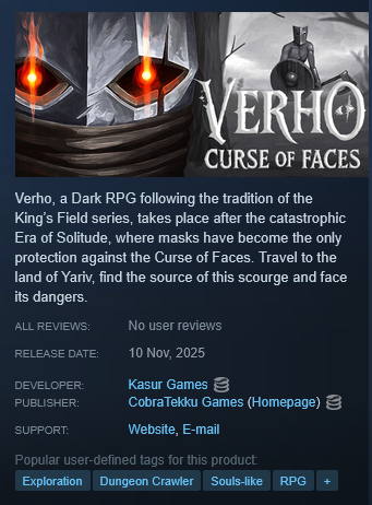 I have been following the dev's youtube channel for bit over a year, I do hope the game turns out good cause I love schizo shit and fairy tale stuff