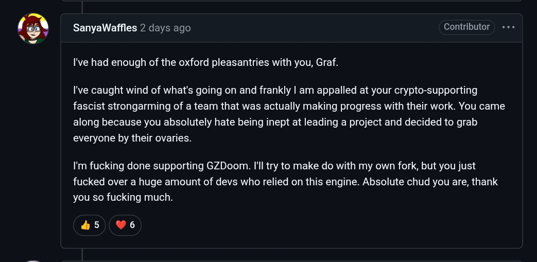 Gzdoom is THE most popular doom source port and the freak doom devs hate the guy but it's HIS project and they have been waiting for ANY valid excuse to throw him under the bus. This is it. They hate him for being a "chud" so they want to take all his decade plus of hard work and go do their own thing.