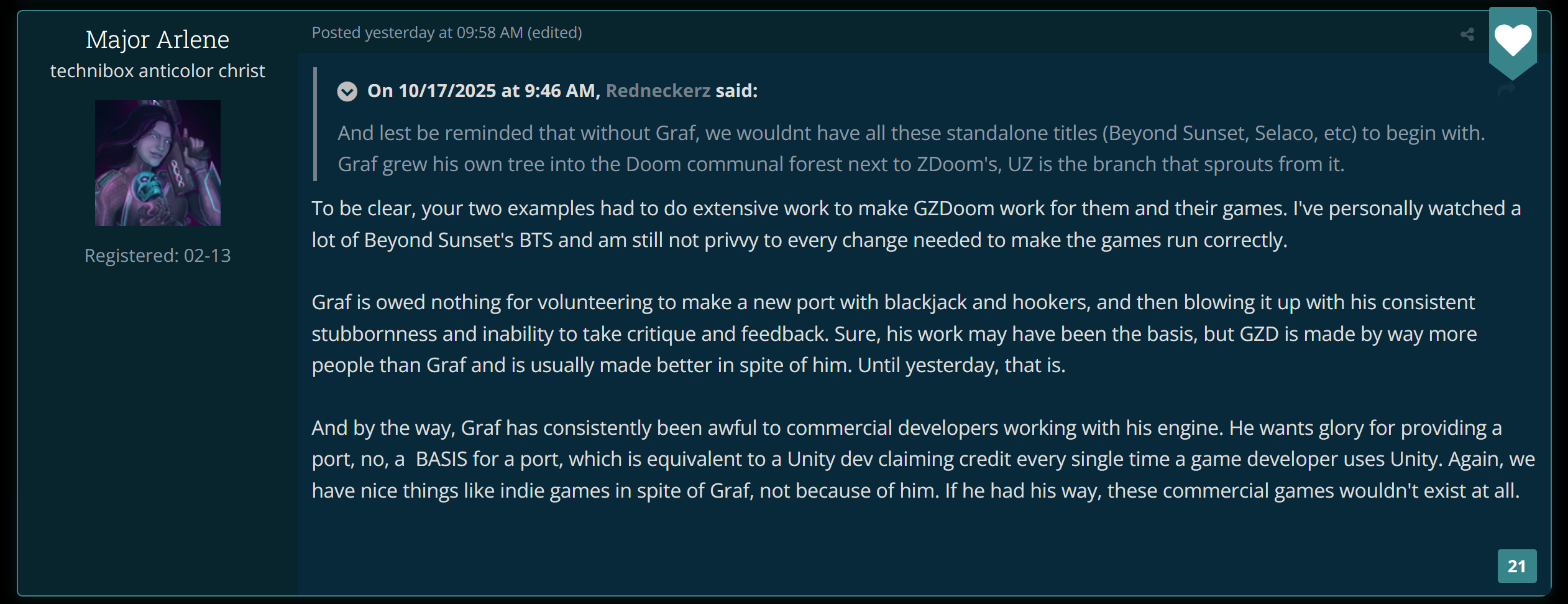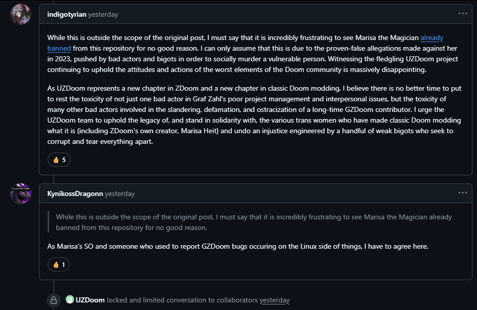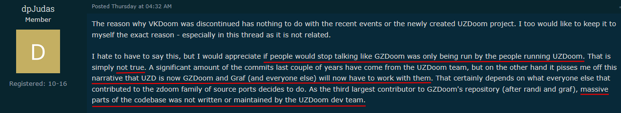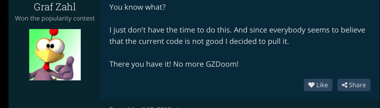 Keep in mind that Graf Zahl isn't innocent either. He didn't want to support AMD/ATI cards and almost killed GZDoom with the lilith fiasco right when ZDoom ended development in 2017