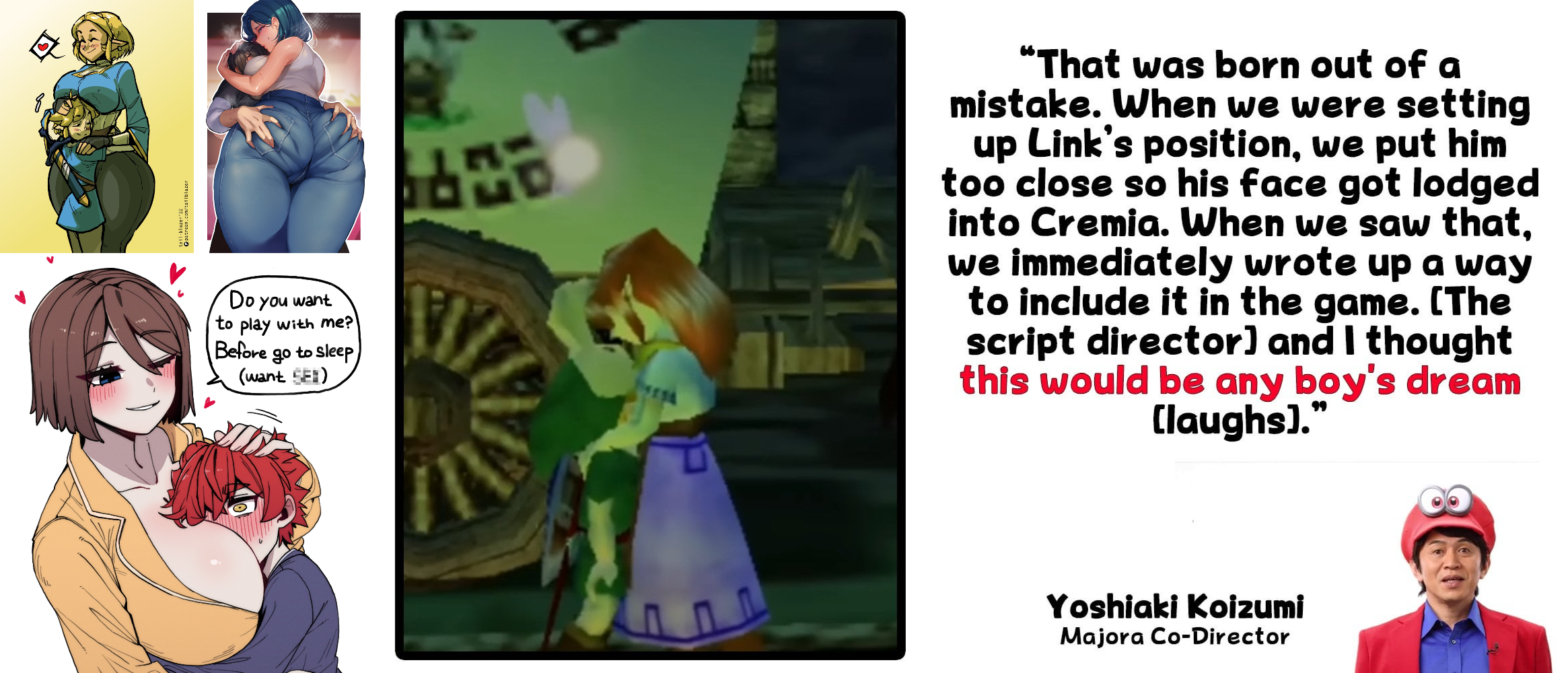 Requesting Link hugging Cremia grabbing her ass as she holds his face closer to her breasts, like those references with the same dialogue as in the bottom reference on the left.