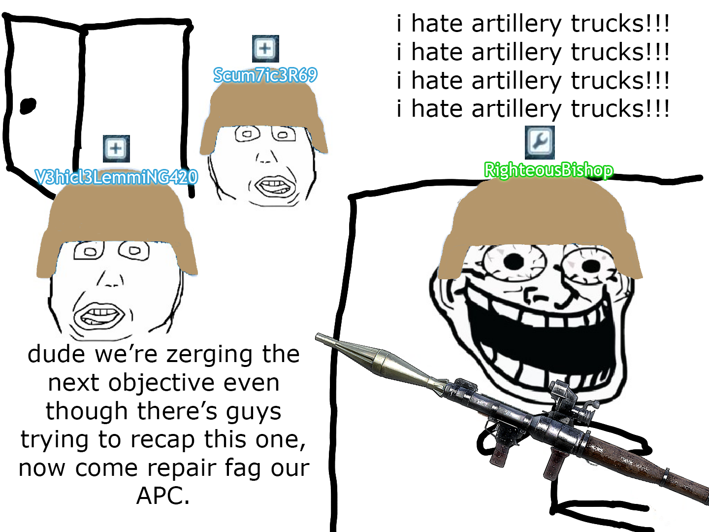 Also vehicles need their handling fixed, and why the fuck is the third person camera in the attack helicopter so fucking bad? It's miserable to use, and you can't use first person because 3/4 of your screen is your gunner's helmet (apache moment)