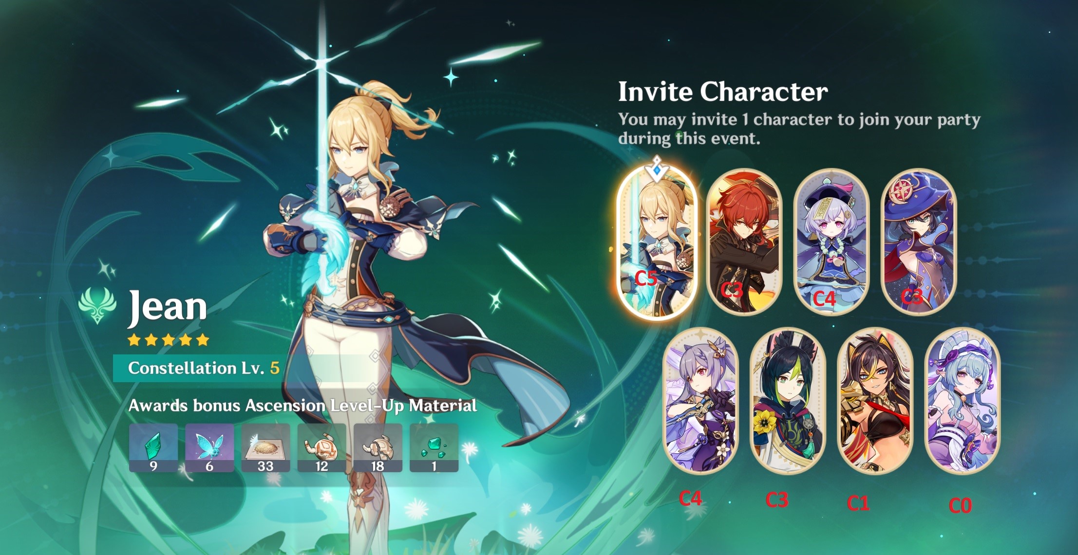 - Jean (C5->C6): I don't really use her except for healing sometimes, but she's my only 5* even close to C6, and my only possibility to ever get a Masterless Stella Fortuna