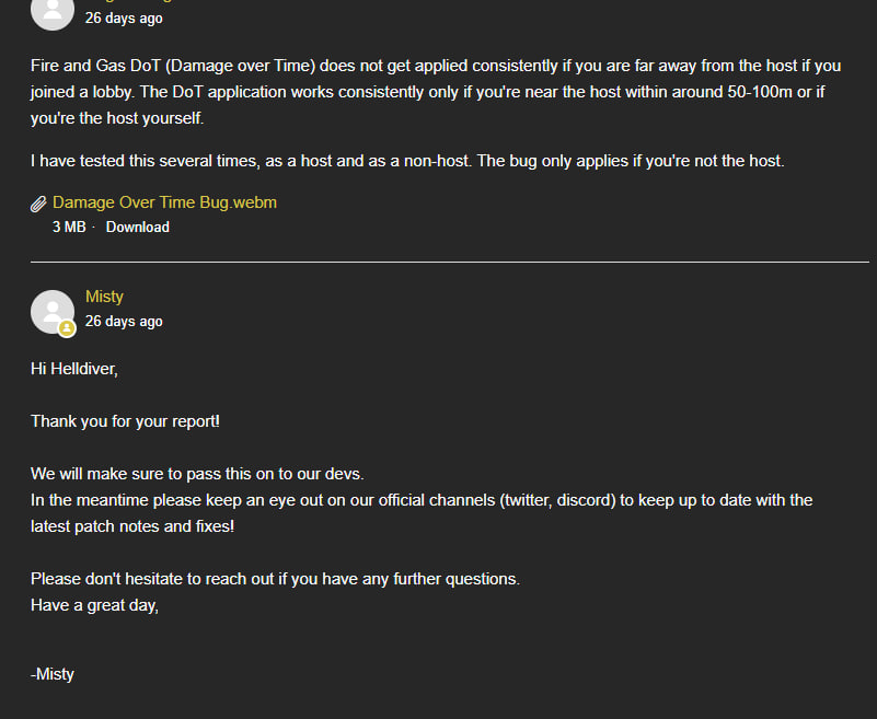 Just remember that they priotize beneficial bugs over game breaking bugs like how Exosuit used to let dying players with the Control Group armor survive or Warp Pack used to let people get off pelicans as it fucks off because its funny