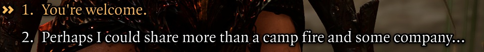 >A: Many companion and romance interactions occur when long resting. Some early lower priority camp scenes can also be missed if higher priority ones are queued. To advance companion quests or romances, make sure to long rest often.