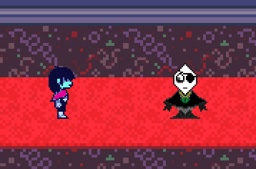 The pink of the scarf standing out on Ralsei's outfit matches the red of Kris's scarf/cape/scape/carf, which also stands out on Kris's outfit. Kris is interested in magic but can't use it, and Ralsei gets a mage/wizard-looking outfit... But then Ralsei takes the wizard hat off after chapter 1 anyway (and has white fur instead of dark fur but that's unrelated to the cosmetics). The outfits the fun gang wear seem reflective of their personal taste in fashion which relates to their personality (wardrobe flavor text and Susie's spike/punk/shredded clothes favoring).