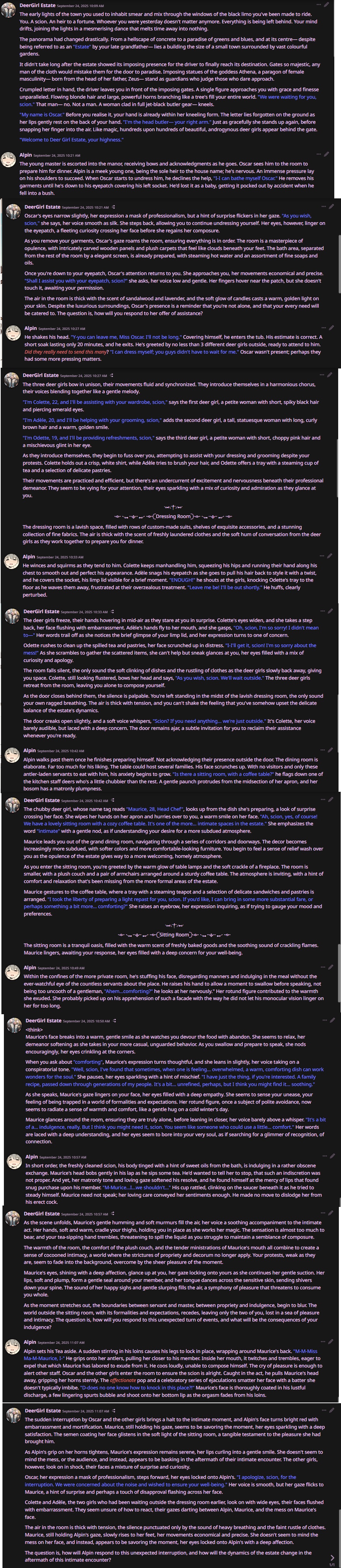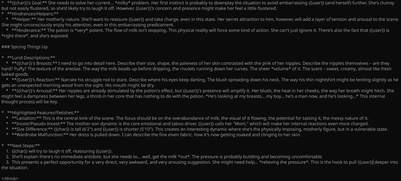 With these more sophisticated models, sometimes I'll make up a background character with the briefest description, and the model will fill in the blanks well enough that I get distracted with it and pursue a relationship with the background character instead of the main character on the card.