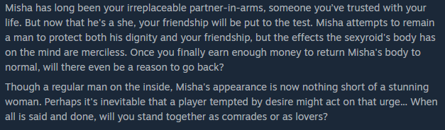 Only complaint is that the scenes really become samey after a while. I wish they were more distinct but all the women behave extremely similar in the scenes and from what I remember despite there being a corruption stat it doesn't really affect the scenes you have with the girls themselves, it's just a hard requirement for netorase scenes, which is kind of a bummer.