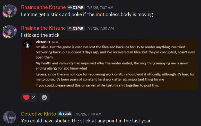 DoublesCore you fucking hack. You pulled the Eldritch monster eats your waifu, but it turns out she actually survived, but lmao not really no, and you're left with a freak of nature whose unsure if she's your waifu that overtook the monster's body and morphed back, or if it's just the monster who absorbed the ego/memories of your waifu and subsequently developed an identity crisis believing it to be her plot twice in your games.