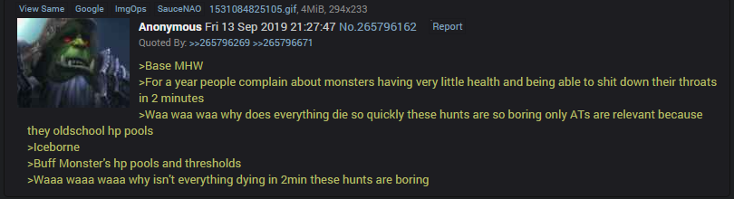 Half of these newfags didn't experience vanilla base world. I hate it more than base Wilds, particularly because the weapon designs are absolute dogshit, but there was more to hate.