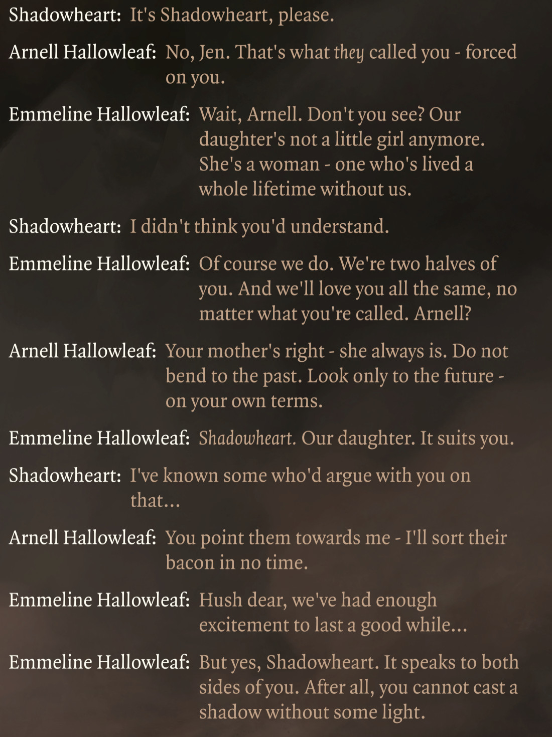 Yes - acknowledging that it would take time and effort to let go of a name she has internalized for 40 years is not a point of contention for anyone. The original point of contention was whether the "You can't cast a shadow without some light" line is cringy and forced, that's all. That Shadowheart is tentatively starting to accept her birth name after six months seems to indicate that Mintharafag was right, in the sense that the line was written more for a punchy effect than to convey true acceptance. It's really not a big deal either way. Shadowheart can get away with somewhat dorky lines, because they add to her charm.