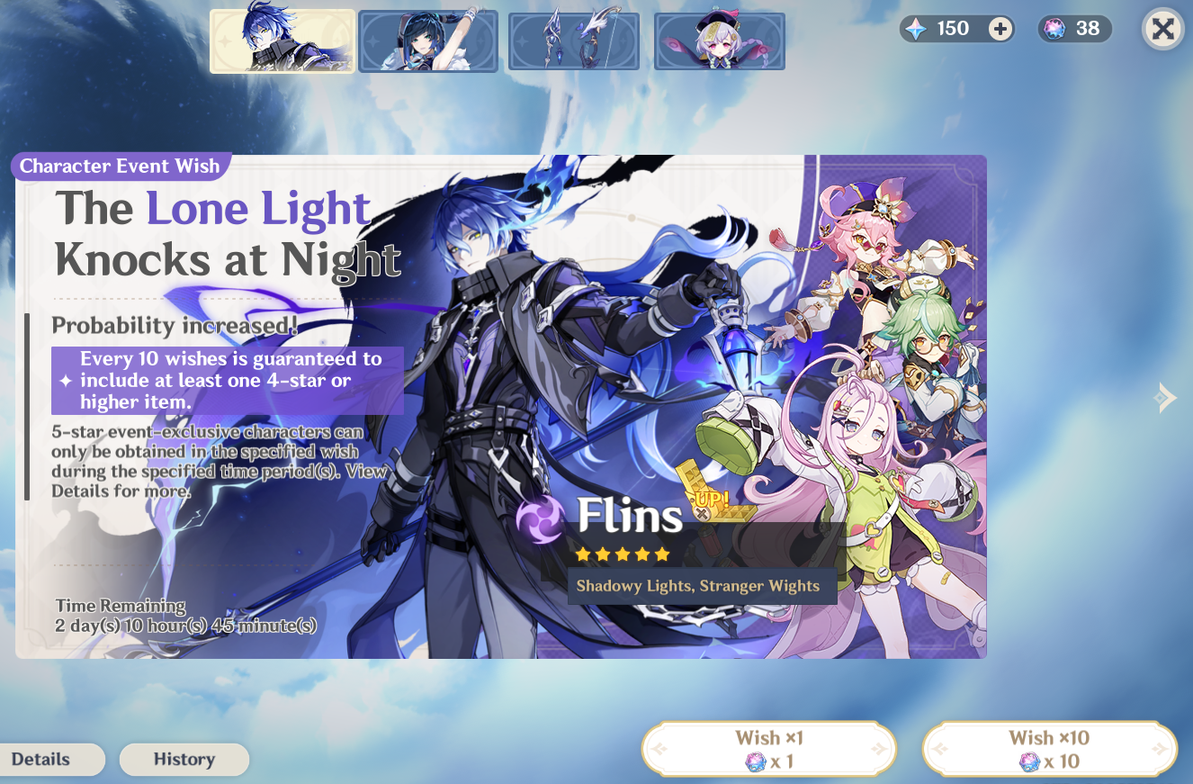 >Current character banner: Flins, Yelan, Aino, Sucrose, Dori