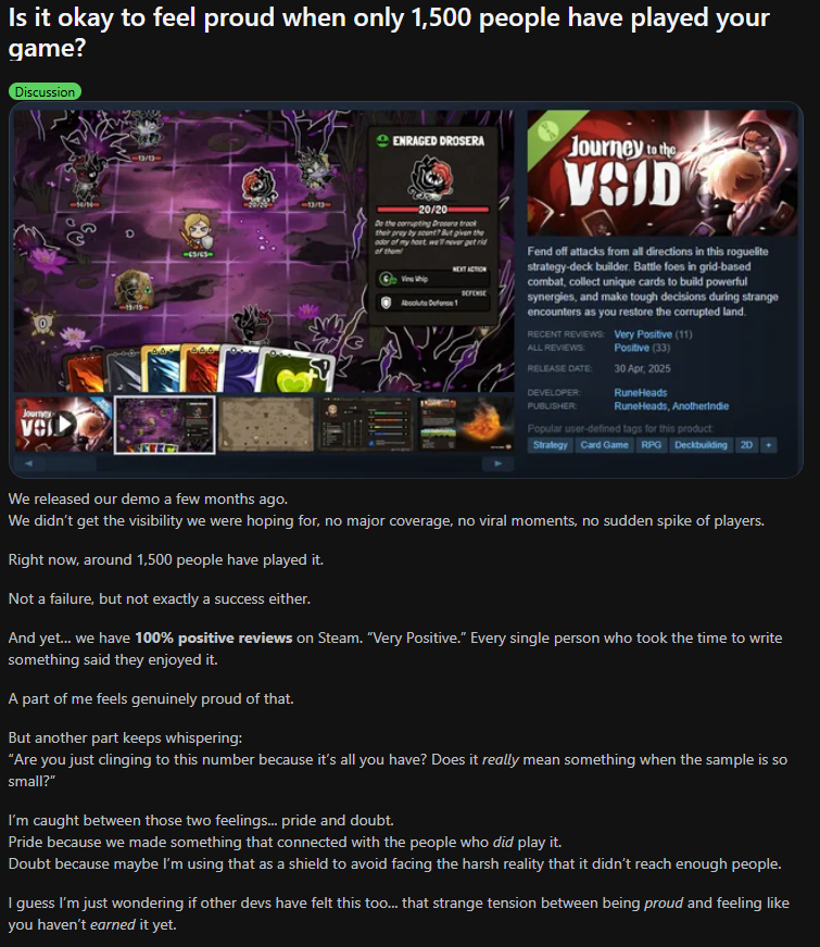 What's the point of making games when it would take years upon years of hard work to reach the top 1% and even then, is a gamble that is not guaranteed to work.