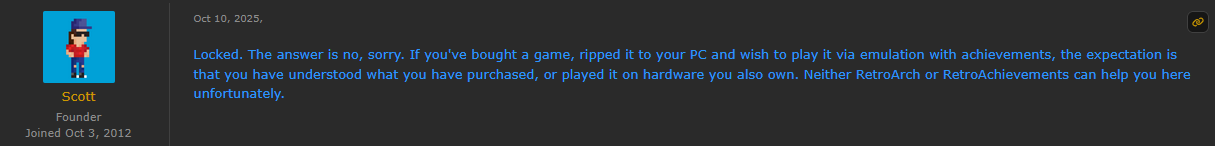 /vr/ is the closest connection I have to the retro community, and I hope these discussions inspire an emulation dev to remove RA integration from it.
