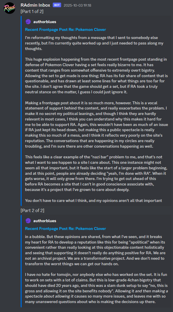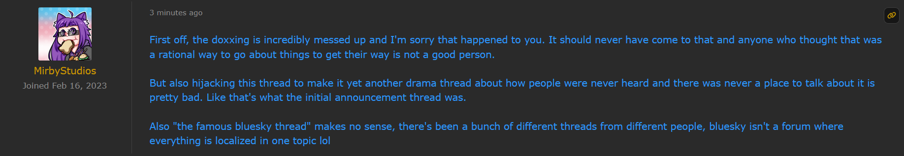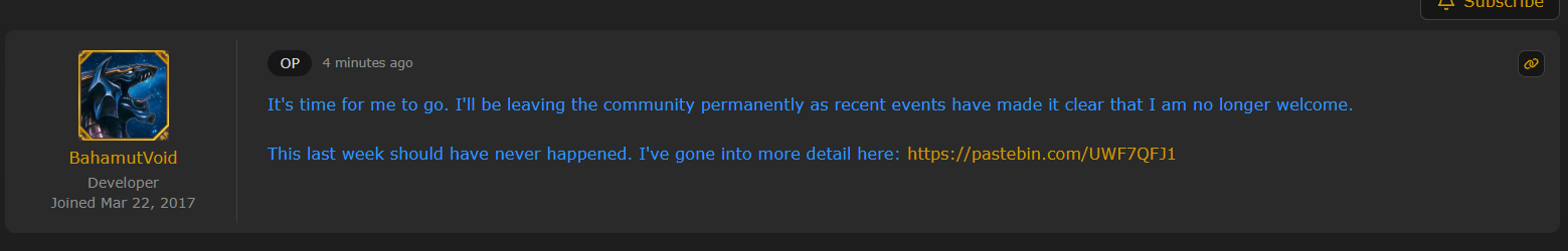 Absolutely insane that they still haven't revealed who doxxed him. They haven't officially admitted what happened. Instead they nuked BahamutVoid's account and are pretending like nothing happened. He contributed so much to the project, just disgusting treating him like this.