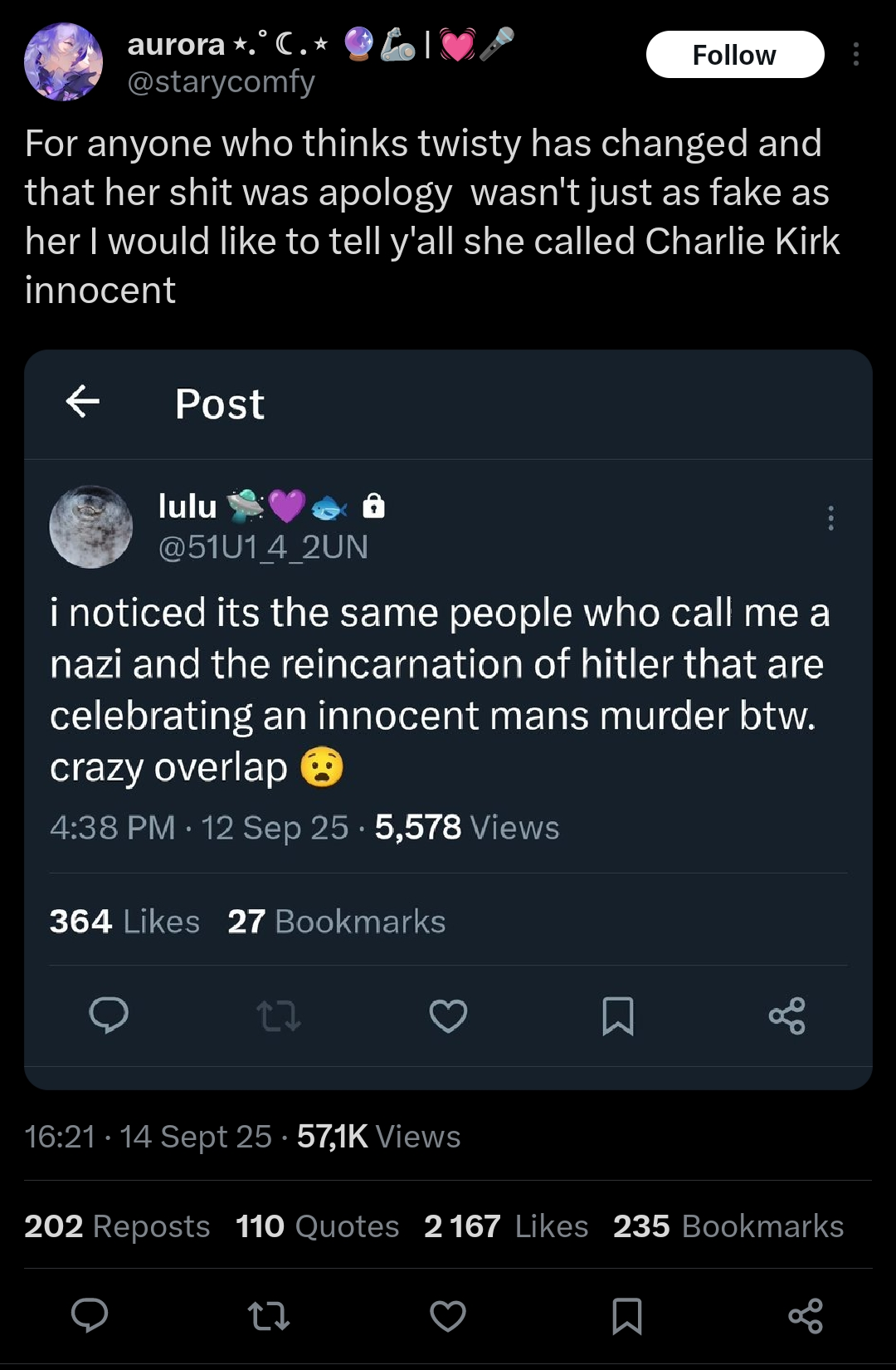 Honestly the people who are going into that stargazer's comments to argue are genuinely retarded, what do they realistically expect is going to happen? Gee I sure was firm in my beliefs before but now that you have said "Twisty is right and you're a demon" I have changed my mind with no further evidence. People who use twitter have such an enormous ego and think their posts have the power to change the world or some shit.