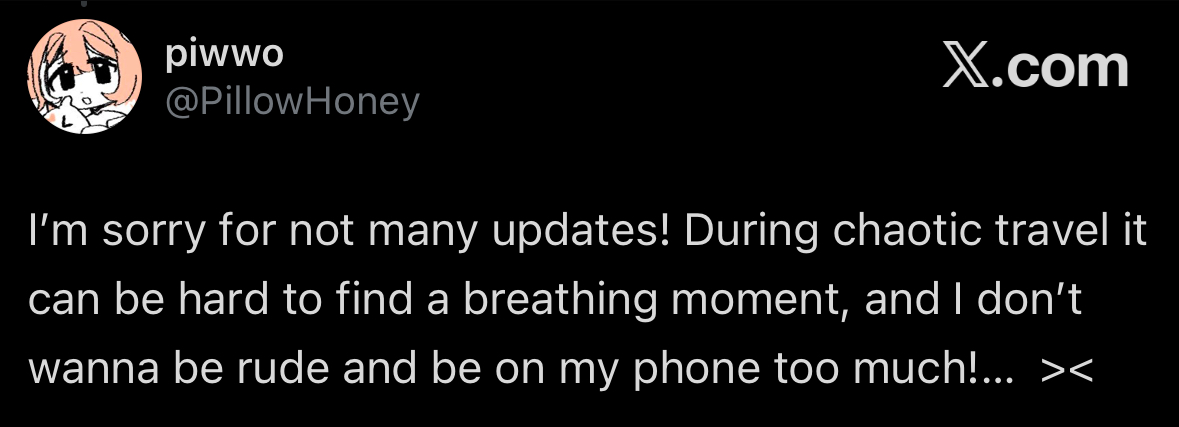 She literally doesn't owe anyone anything. They can get upset, but she's not working, she's traveling and enjoying herself and doesn't need to babysit people's feelings. She never said "Make sure you sit and schitzo out over when I tweet", all she's ever asked is that Piwows care about her, and it's a lot more loving towards her to not build up retarded expectations like that.