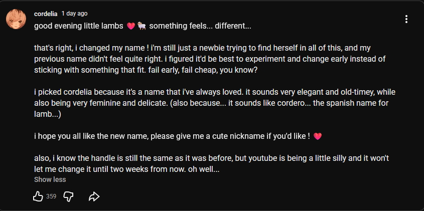 Anon... that was Nene. Do you remember how every stream would take at least twenty minutes, sometimes more, of I love yous. One day she stopped doing that cold.