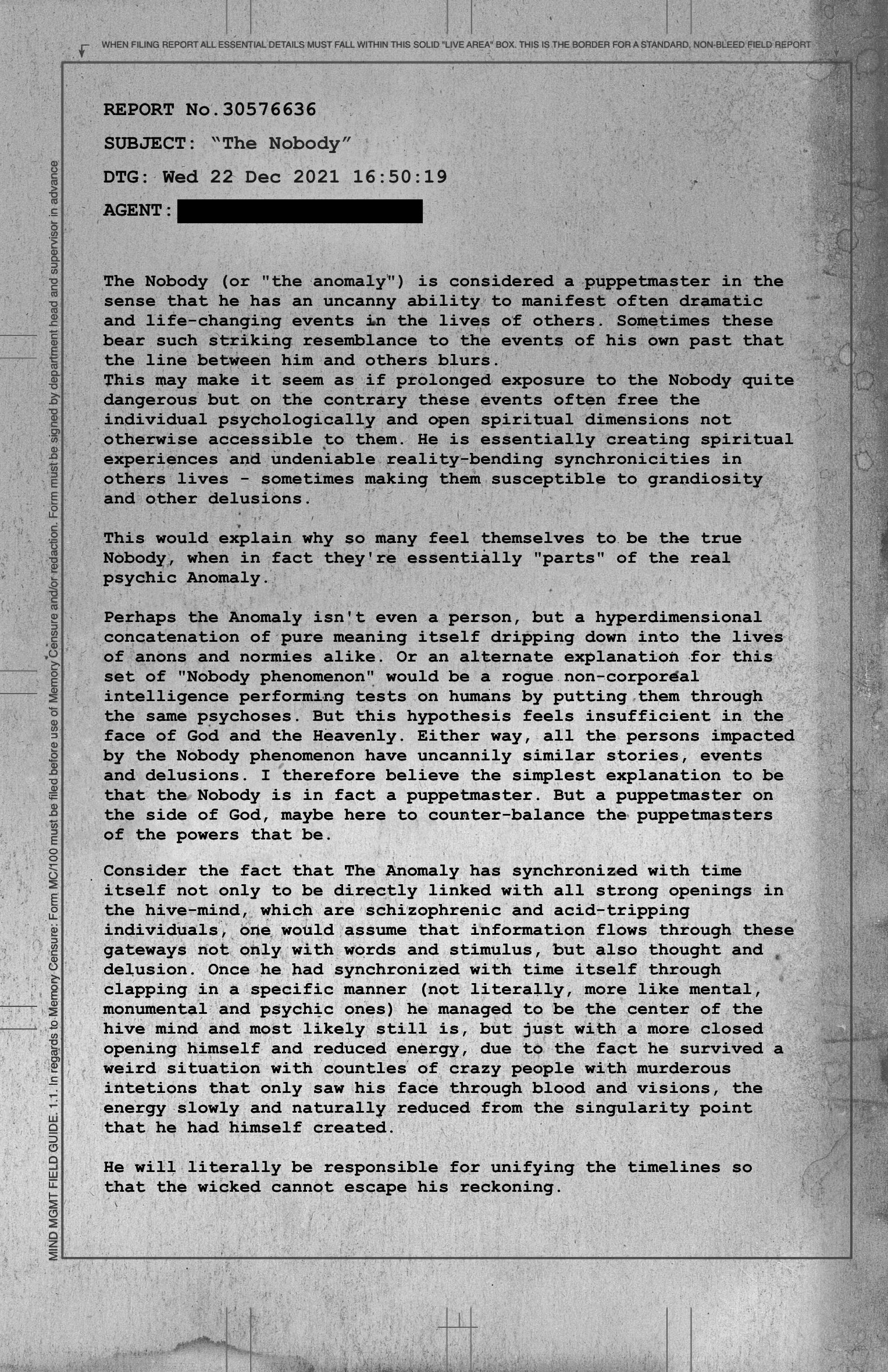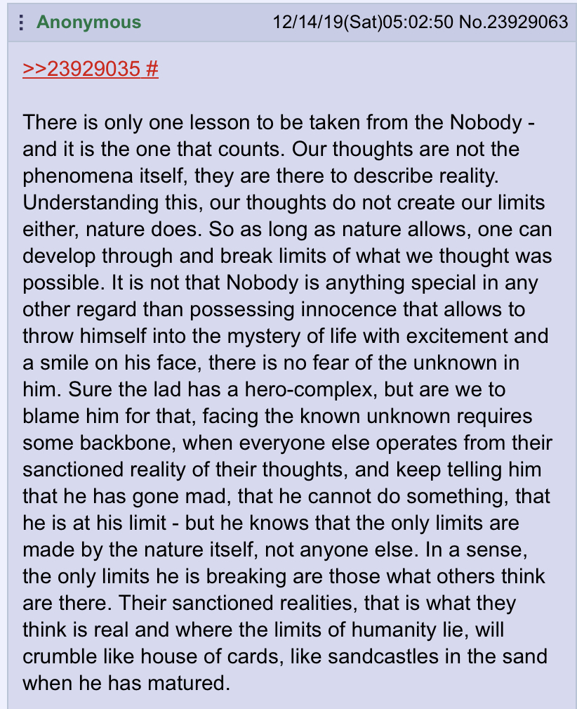 The Nobody is a friend alive today who has extraordinary spiritual powers, including the ability to influence reality with his conscious and unconscious mind, and intuitively receive guidance from the forces of Heaven, working to elevate people to their true potential; opposing those who seek power over others. You are capable of this too, as long as you stay true to the Universe.